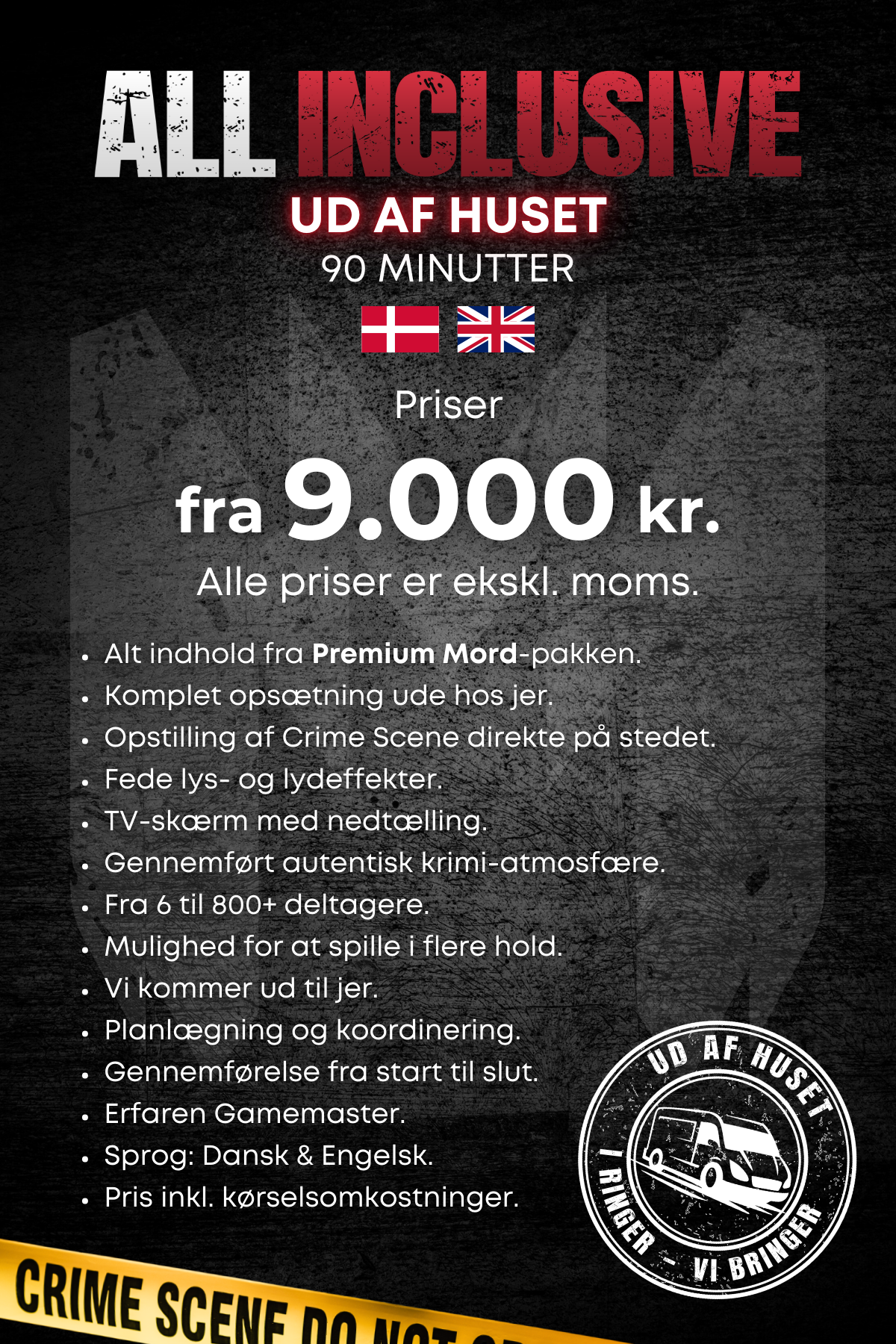 Vi tilbyder Ud af huset-events, hvor vi kommer direkte ud til jer – uanset om det er i virksomheden, på kontoret eller på en location efter jeres ønske! Hvert event bliver altså til jeres helt personlige gerningssted!