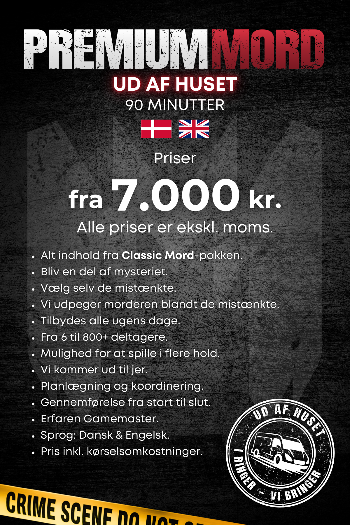Mord Ministeriet er Danmarks største udbyder af spændende krimispil, som spilles ude af huset - direkte hos jer! I skal blot stille lokalet til rådighed – så vi sørger for resten.Kort sagt: Et mord er blevet begået, og jeres opgave er at finde ud af, hvem der står bag.